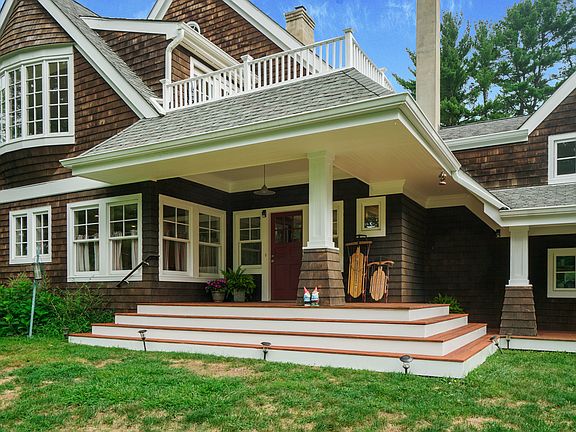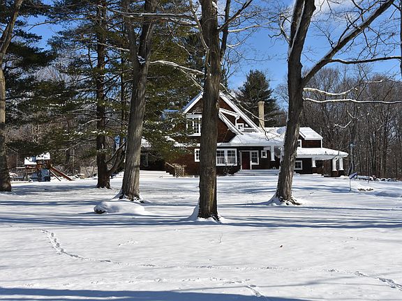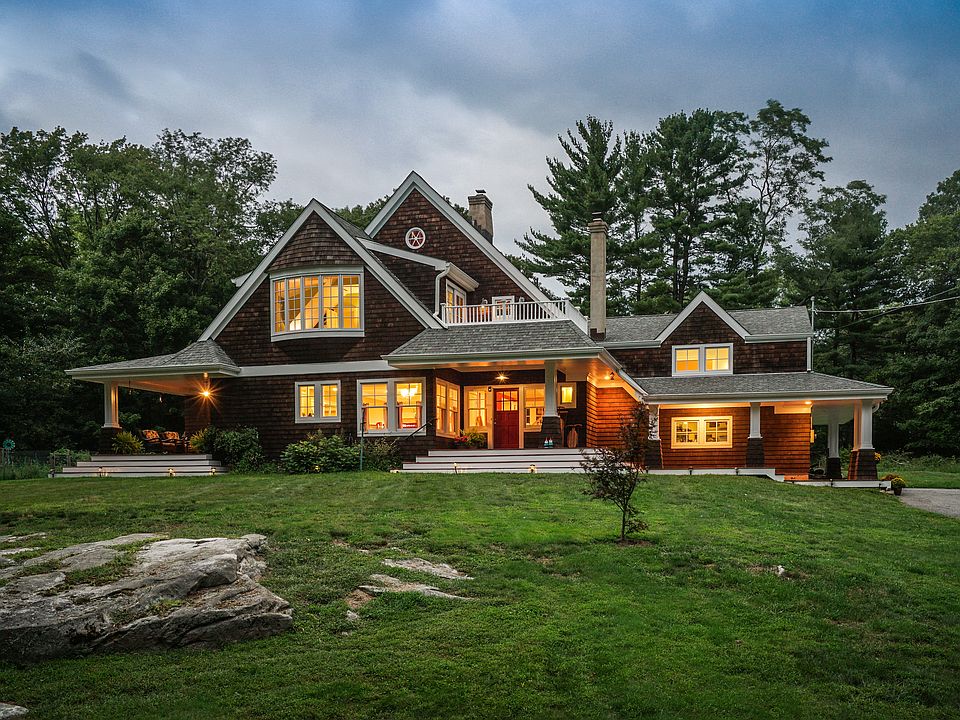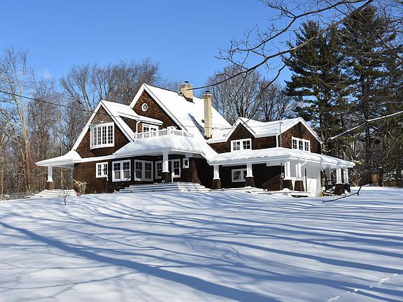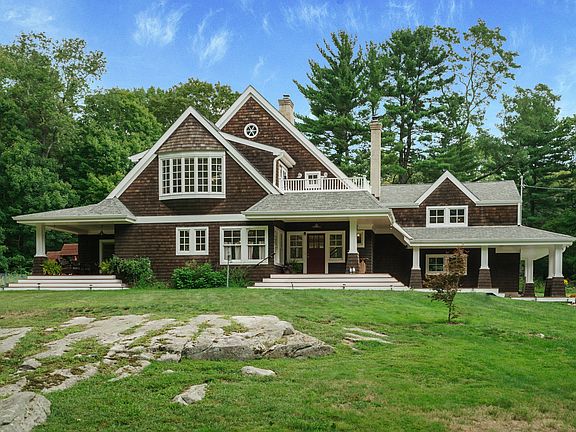 This handsome, sophisticated, shingle style home has tremendous curb appeal. The open floor plan includes a large sun drenched eat in kitchen opening to the great room with fireplace, custom wainscotting, moldings, 9 1/2 ft ceilings and french doors out to stone patio. Dining room french doors open to its own covered porch. Main level also includes a powder room, laundry room, first floor bedroom and full bath. Level 2 has large, playroom/bonus room with cathedral ceilings and a full bath. Level 3 has master bedroom with private sunporch, master bathroom with claw foot tub and steam shower, and 2nd bedroom with a full bath. There is an approved location for an additional 3 bay garage with extra studio space above. This home was extensively redone and enlarged in 2000 to open it up and create this great looking home on level land with lawn, play areas, age old trees on a country road close to town and shopping making this a convenient and special property. Star of $1129 not included