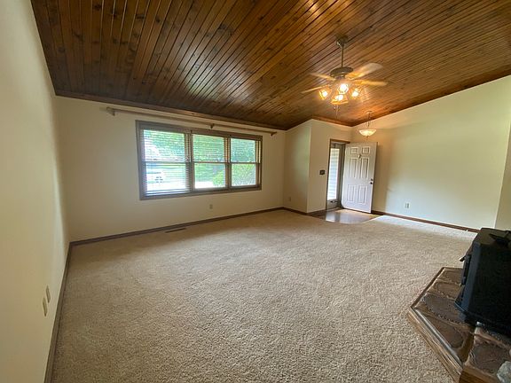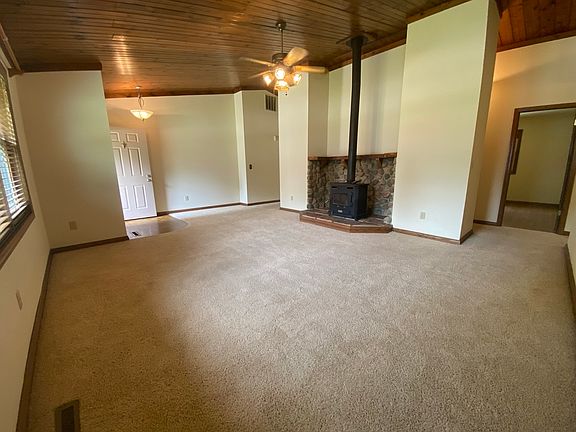 Large fenced backyardLarge attached garageGood storage spaceBreakfast barStone hearthWood vaulted ceilingHardwood floors