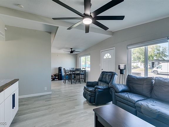 Beautifully renovated Henderson smart home with no HOA! HUGE lot. This modern, cozy retreat features an open-concept layout with luxury laminate flooring, fresh paint, and tons of natural light. The stylish kitchen boasts white shaker cabinets, quartz counters, tile backsplash, and stainless-steel appliances. Enjoy the inviting living room with a charming wood-burning fireplace and large TV with sound bar. Both bathrooms are fully updated with designer tile, black fixtures, and modern finishes. Spacious bedrooms offer comfort and character with exposed beams and plush carpet. Outside, the large backyard with covered patio provides endless potential! Perfect for entertaining or adding a pool. With a huge driveway, carport, RV parking, and low-maintenance landscaping, this move-in-ready gem blends style and Henderson charm, all without HOA restrictions! Do not miss this opportunity, call us today!
