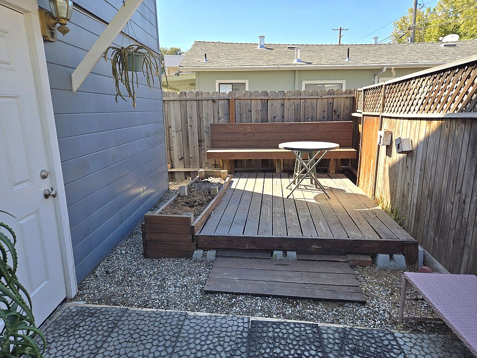 Ground-floor modern 1 BR unit with own garden / deck and washer/dryer within a 2-story duplex on a cul de sac street. Central heat and AC. Lives like a house and without busy crowds like in apartments. Garage as an additional option. Main garden / yard has fruit trees (white peach, orange, loquat), goji berries and raspberries.