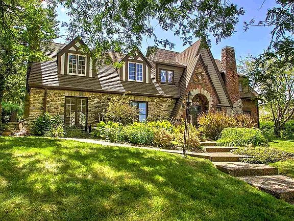 Explore this iconic tudor built by Otto Schoitz in the exclusive Kingbard Hill neighborhood. Situated on a double lot with mature trees, gorgeous greenery and stacked rock wall, this stunning 4 bed, 2.5 bath home is a breathtaking example of the lost art of true craftsmanship. The exterior brick and stone architecture captures your imagination with intricate detail and style. When you enter through the wrought iron gates at the front door, you are greeted by a grand staircase and foyer. The ornate vintage light fixtures compliment the various cove moldings and window pane trim work. Enjoy the expansive great room with original Italian marble fireplace, floor to ceiling windows and 9 foot ceilings. The hardwood floors gleam in the sunlight, and the main floor is complimented with a second family room and butlers pantry. The kitchen has many modern updates such as stainless appliances, marble counters and custom cabinetry. Adjacent to the kitchen is a large informal dining area and mudroom. The main floor guest lavatory is a whimsical reminder of the Art Deco era. As you ascend the grand staircase to the second level, three of the bedrooms are situated to one end near the classic pink pearl bathroom. The main bedroom, walk in closet and bath are privately situated on the opposite end of the floor plan. The second floor solarium provides an added living space with endless possibilities. The two car garage entry is secluded from the alleyway. The backyard boasts sunlight with the southern exposure and firelight from the fire pit feature in the pergola. The lower level has ample storage, a wine cellar, and extra half bath, and a recreation room with a fireplace. Updated HVAC and electrical panel make this classic home a modern comfort. The durability of the steel roof has a 50 year life span. There are simply not enough words to capture the detail and wonder of this beautiful home. Schedule your tour today.