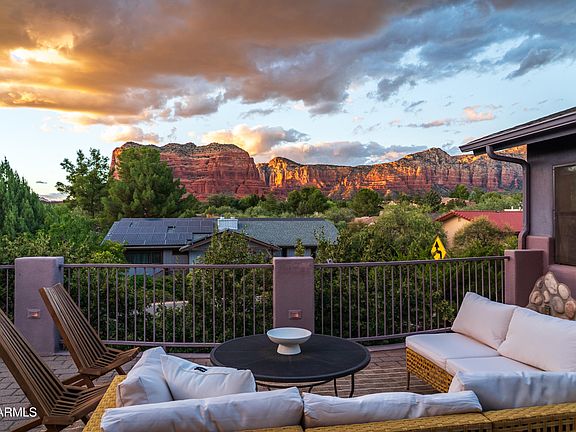 VIEWS galore in this beautifully appointed home in desirable Cathedral View neighborhood! Home sits up from the street for privacy and has unobstructed red rock mountain views including Sedona's famous rock formation, Bell Rock. Wood beam high ceilings and natural rock fireplace impress upon entering, pause here to admire that million-dollar view! Turn right and find an entertainer's dream, open-concept kitchen that seamlessly flows with its rich granite surfaces complete with breakfast bar, pantry, and hickory cabinetry. Imagine spending a wintry day inside near the juniper wood mantel fireplace watching snowfall over Bell Rock and Courthouse Butte, while you smell the cookies baking in the chef's kitchen. The flow continues to a spacious living area, dining room, and out to the back patio. Three-bedroom, two full bath floor plan provides plenty of room for guests as there is a fourth auxiliary bedroom/bonus room all the while creating a home of utmost comfort and privacy from all rooms and patios. Upscale finishings include porcelain plank tile flooring, hickory cabinetry, granite countertops, KitchenAid stainless appliances, dual zone HVAC for heating/cooling and whole house stereo sound. The sunken living room has complete privacy with mesa views and a privacy wall-so you can truly relax. The large primary bedroom suite measures 24'x 13' with full bath and jacuzzi tub/shower. It also has a wood-burning stone fireplace of its own. Welcoming guest bedrooms both have mesa views and ample closet space with a shared full bath. Skylights throughout the home provide natural light against a backdrop of clean aesthetics. A 19.9' x 17' auxiliary guest bedroom off the primary suite will amaze you with "must see to experience" majestic red rock views for your home office or can also be a gaming room, podcast studio with red rock backdrop, art studio, or yoga/Pilates workout room. This room has its own doorway to the front patio with those red rock mountains smack, dab center view. Use your imagination for how you purpose it, but it has a wood burning stove with custom rock wall backdrop, and its own mini split A/C unit. You can suit up for a short drive or bike ride to the Sedona Spa with six Pickleball courts, all day fitness classes, and members only pool where you can pamper yourself so very close to home.