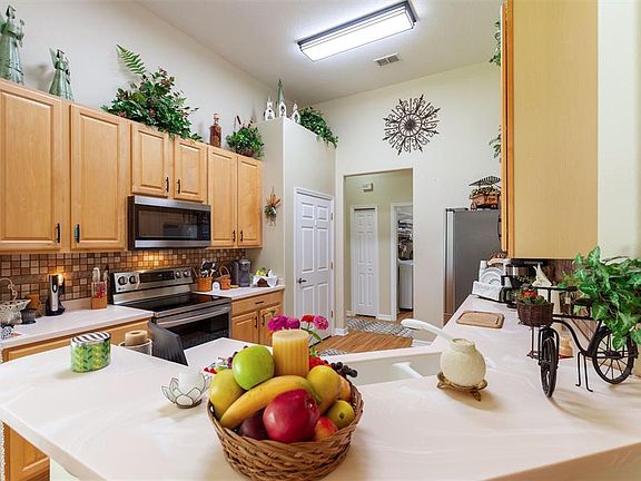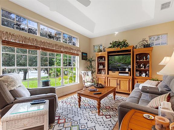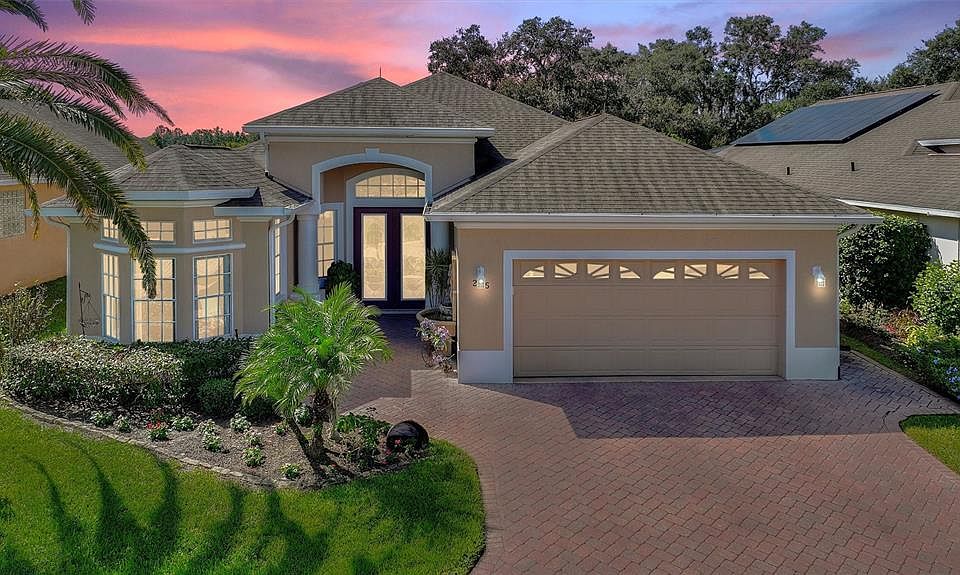 One or more photo(s) has been virtually staged. Mostly Furnished Water-Front RidgeBrooke 3/2/Family Room/Den model with a 481 SF west-facing Florida Room Overlooking the Pond between High Vista and Del Webb 55+ communities, located 0.2 miles from High Vista's private clubhouse and amenity center. List Price is below 2024 independent appraisal which also cited an effective age of this property as 8 years. Expanded brick paver driveway and walkway to the 8 FT leaded-glass double front doors with adjacent water fountain adorned by cherubs. 12 FT ceiling in central Great Room with 2 skylights and full-view patio doors to Florida Room with skylight and 3 walls of sun-shaded windows. Widened galley kitchen has solid wood cabinets, stainless-steel appliances, custom tile backsplash, solid-surface breakfast bar and countertops with seamless sink and a closet pantry. Adjacent family room with tray ceiling and dining area has western water view. 8 FT double doors to primary en suite bedroom with dual closets, tray ceiling and updated full bathroom with shower, linen closet and separate steam room. Split bedroom design offers privacy to guests with a full bath and linen closet between 2 guest bedrooms. Bay window elevation in front Den. Custom crown molding in many rooms. 2024 Water Heater. 2014 Roof. 2020 & 2013 HVAC units, both serviced annually. 4-Point Inspection dated 9/24/25 is available for view upon request. ALL COMPLETE WRITTEN OFFERS WILL BE PRESENTED TO SELLER ON 11/5/2025. Sold As-Is. Ridgewood Lakes is a golf cart friendly community. $230 monthly High Vista HOA fee includes Spectrum internet and basic cable TV with 2 cable boxes, lawn mowing and exclusive access to resident-owned 12,000 SF private High Vista clubhouse and amenities. $425 semi-annual Ridgewood Lakes HOA fee provides 24x7 staffed security gate and master association-owned private road maintenance. Adjacent to 18-hole White Heron Golf Club with The Nest restaurant, privately owned and open to the public. High Vista is a 55+ community with outdoor heated pool and spa, fitness center, library, pub & many organized activities. Pickle ball, tennis, bocce and shuffleboard courts. Miles of biking and walking trails within Ridgewood Lakes gated community. Shopping, Disney, Universal, Orlando & Central FL entertainment nearby, easy access to I-4, medical facilities, airports & Sunrail Station. Advent Health hospital is 3 miles away.