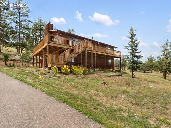 COME SEE THIS BEAUTIFUL AND MAJESTIC HOME AND MAKE IT YOUR OWN! EVERYTHING FROM THE GORGEOUS VIEW, THE SPACIOUS OPEN- FLOOR PLAN, AND THE NATURAL LIGHT IS PERFECT FOR HANGING OUT AND ENTERTAINING. Tucked away on a spacious 2.02-acre lot filled with towering pines and mature trees, this mountain raised ranch home offers privacy, beauty, and room to explore right outside your door. Whether it’s summer barbecues, kids’ adventures in the trees, or quiet evenings on the deck, this property truly delivers an outdoor Colorado lifestyle. Inside, vaulted pine ceilings and a striking stone fireplace create a warm, cabin-like atmosphere, while the modern kitchen is perfect for gatherings. The large family room is cozy with upgraded flooring. Custom blacktop driveway, 2 car garage and workspace, additional detached garage w/concrete floor makes great storage for those toys and tools. There is plenty of room to park that RV! Come home to beautiful mountain living!