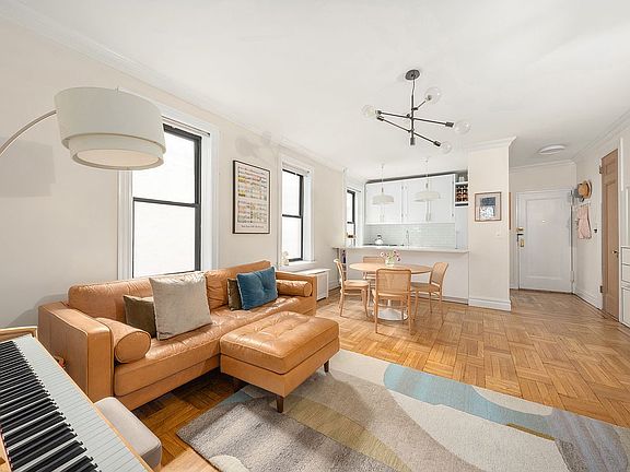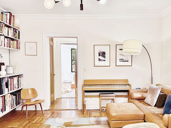 Prewar details throughout include nine foot ceiling heights, original oak flooring, stripped original doors with moldings, brass hardware and glass knobs, and multiple closets with eight foot high doors.