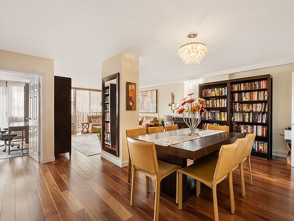 The sun-filled living and dining room enjoys south-facing, tree-lined views, while the chef's kitchen is equipped with Thermador appliances and a walk-in pantry. The primary suite features a walk-in closet and a luxurious marble bath with double vanities and an oversized jacuzzi tub. Two additional spacious bedrooms offer ample closet space and adjacent full baths, providing flexibility for guests, family, or a home office.
