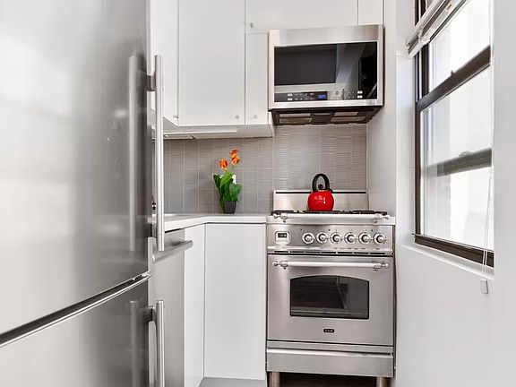 SHOWINGS MUST BE SCHEDULED 24 HOURS IN ADVANCE. Perfect triple mint pied a terre or starter home at an affordable price in Lenox Hill. The cheerful living area faces north, with a separate windowed kitchen offering stainless steel appliances and a newly renovated bathroom. Excellent use of space includes creative built-ins for additional storage such as an efficient space saver that swivels 180 degrees on a column that rests on the floor and is attached to the wall. Additionally, there is storage below the television and a built-in murphy bed. This renovated turnkey apartment has three generously sized closets including one that is a walk-in closet. Thru wall AC completes this wonderful home as well as motorized shades and state-of-the-art furnishings that the owner is willing to include in the price. The Dover House is an exceptional co-op well known for its spectacular roof deck. This pet-friendly door attendant building offers its shareholders a bike room, storage, and laundry facility. Pieds-a-terre and guarantors allowed on a case-by-case basis. No co-purchases. One Avenue to the 6 train, 5 blocks to the Q train, and convenient to all that Manhattan has to offer!