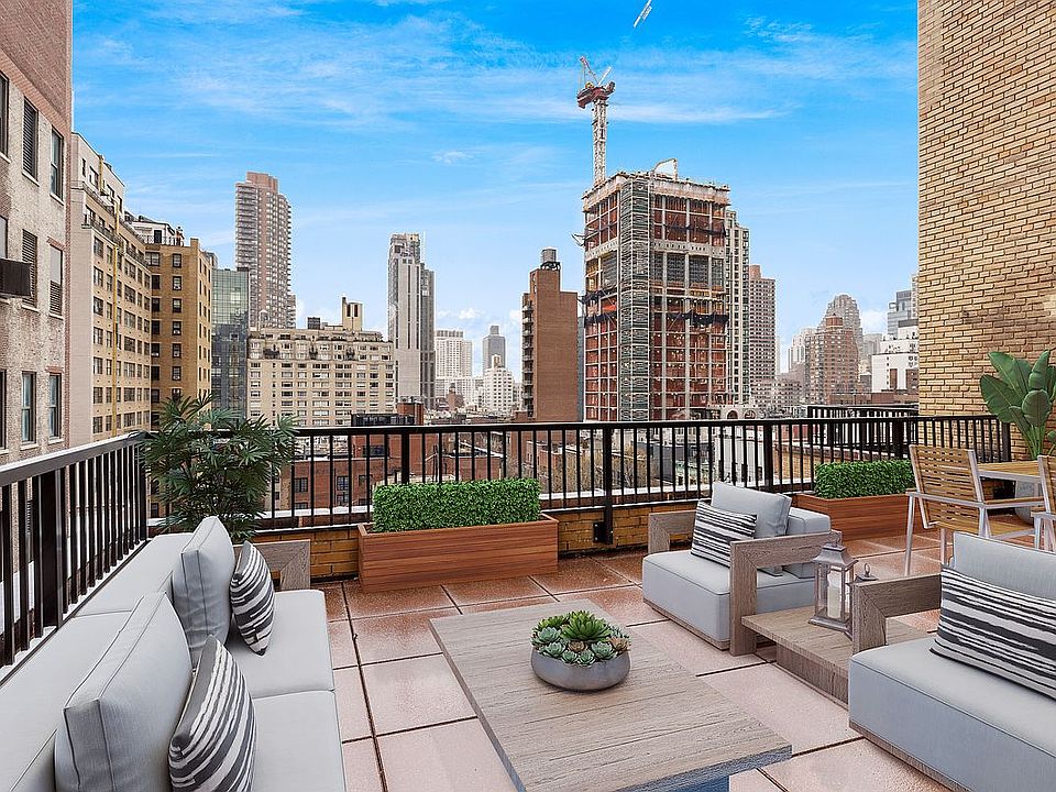 Newly renovated and never occupied; this rare & glamorous double terraced (one spectacularly huge and one smaller off the BR) 1BR/1Bath residence features open Eastern city views, windowed kitchen w/ top-of-the line appliances, washer/dryer, lovely prewar-inspired bathroom w/ window and walk-in shower, and charming details throughout including hardwood floors, beamed ceilings and WBFP.