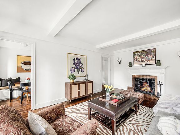 Located on a sun-drenched corner with South and West exposures, this home enjoys lovely views over tree-lined streets and offers a tranquil urban retreat with prewar elegance at every turn. The gracious layout includes a spacious living room anchored by a striking wood-burning fireplace with a beautiful original detail — the perfect setting for quiet evenings or intimate entertaining. Original hardwood floors and beamed high ceilings enhance the charm and functionality of the space.