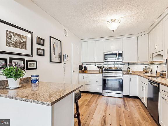 Bright and beautiful condo in The Ridgely, located in the heart of Towson. Impeccably maintained, 2 bedroom, 2 bath, 4th floor unit with 1 deeded parking space in the secure garage and 24 Hour Front Desk Staff. Unit 403 features an open floor plan with luxury vinyl plank flooring throughout the living areas and the kitchen (installed 2023). The entry hall features a large coat coset with new doors. The remodeled kitchen (2015) is open to the living area and features white, ceiling height cabinetry, granite counters & tile backsplash, undermount sink, seating for 2 at the peninsula, a built-in microwave, stainless steel appliances (all new in 2023), and a large pantry! The living and dining areas are bathed in natural light and there is access to the balcony. The hall bath has an updated vanity/ sink, large mirror and medicine cabinet. The laundry is located across from the hall bath and has loads of storage cabinets. The washer and dryer are newly replaced and the laundry closet doors are new as well. There is a linen closet in the hall. The primary bedroom has an-ensuite full bath and a large walk-in closet. The primary bath has been updated with new vanity/sink and mirror. The second bedroom features a large walk-in closet. The condo features fresh neutral paint colors and flooring throughout. The central Towson location is close to shopping, dining, public library, Baltimore County Government and Courthouse, hospitals, universities, public transportation and easy access to 695. The building has an outdoor pool, fitness room and plenty of guest parking available. The common areas are beautifully updated and decorated. There are no pending assessments. Renting is limited to relatives of unit owners. See the virtual tour- click on the video camera icon at top of listing. This one is gem!