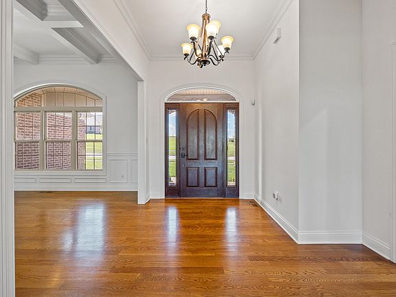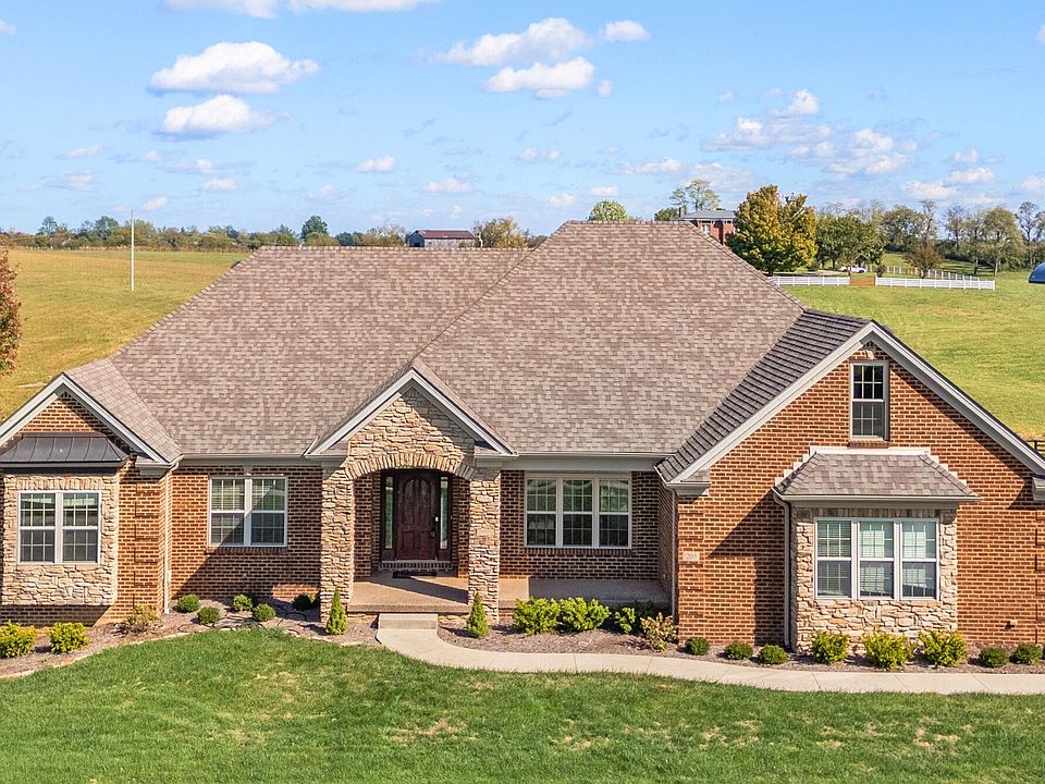 This showstopper custom ranch on a full finished basement was designed for comfort, style, and space for all. Featuring 5BR/3.5BA's, this home is the perfect mix of open-concept living with thoughtful details throughout. The main level welcomes you with a foyer, formal dining room, private office, and a great room with vaulted ceiling and gas log fireplace. The open kitchen offers granite countertops, stainless steel appliances, and a spacious breakfast bay overlooking picturesque farmland. The split-bedroom layout provides a private owner's suite with a huge walk-in closet and spa-like bath, plus two additional bedrooms with a shared Jack-and-Jill bath. The main floor also features a spacious utility room with ample cabinetry and a utility sink. The finished basement is perfect for multigenerational living or entertaining, complete with updated laminate flooring, a large kitchenette, open recreation area, theater or family room space, bonus room, two additional well-proportioned bedrooms, storage, and an auxiliary garage for lawn equipment or hobbies. Outdoor living shines here with a covered back deck, patio, basketball court, and a partially fenced one-acre yard. Additional features include a side-entry two-car garage, covered front porch, hardwood floors, 2025 updated carpet and paint, 2023 roof shingles, and a tankless gas water heater for an endless supply of instant hot water.