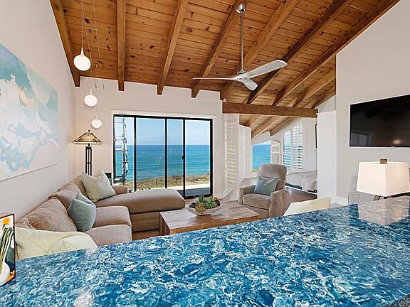 STUNNING TOP FLOOR OCEANFRONT single level beautiful condo with NO STAIRS. Elevator access from the garage that leads right to the front door! 1600 sf. in the exclusive beach resort gated community of Surfsong. One word to describe this property, "BREATHTAKING" with ocean views from the moment you walk through the door. Remodeled kitchen features an island and large dinning area that flows into the ocean view. The open oceanfront living area includes a hidden murphy bed, high wood beam ceilings, abundance of ocean view windows, hard wood floors, a fireplace and 180-degree oceanfront brand new deck that was just remodeled by the HOA. Central forced A/C keeps you comfortable on those warmer days. The Primary bedroom offers a spacious bathroom with relaxing sunken bathtub. This condo comes fully furnished. Resort style amenities include an oceanfront saltwater pool, spa, tennis, pickleball courts, Conveniently located EV Chargers. and direct beach access to Fletcher Cove. Walk or bike to the famous Del Mar Race Track, 5 star restaurants, Belly Up, Cedros Design District, Shopping, the Trolley, and the Ocean sunsets are right in front of you. Enjoy Waking up and falling asleep to the the ocean everyday. This is paradise!