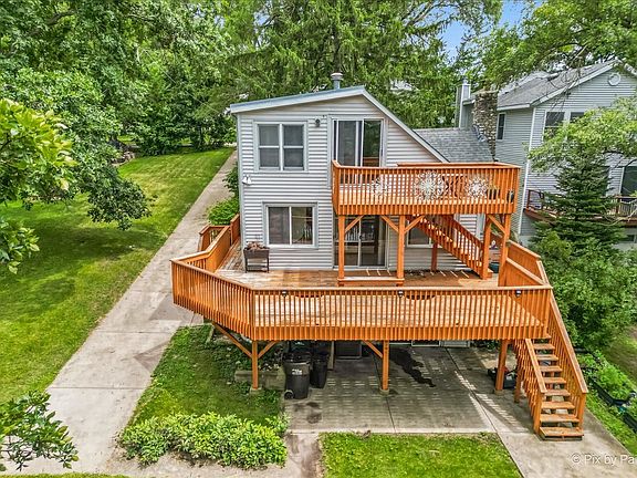 THIS IS YOUR CHANCE TO OWN LAKEFRONT PROPERTY. LOCATED ON ISLAND LAKE (MOTORIZED BOATS ALLOWED ON THE LAKE), THIS 3 BEDROOM 2 FULL BATH TWO-STORY HOUSE IS AWAITING ALL YOUR DESIGN IDEAS. THE FIRST FLOOR HAS AN OPEN FLOOR PLAN WITH HARDWOOD FLOORS THROUGHOUT AND A WOOD BURNING FIREPLACE AND TWO BEDROOOMS. THERE IS A FULL BATH NEAR THE BEDROOMS. ON THE SECOND FLOOR, THERE IS A HUGE MASTER SUITE WITH A FULL BATH AND A BALCONY OVERLOOKING THE LAKE. ENJOY THE SUNSETS OFF THE LAKE ON YOUR LARGE TWO-TIER DECK THAT HAS ACCESS FROM BOTH THE MAIN LEVEL AND SECOND STORY. THE FULL WALKOUT BASEMENT IS UNFINISHED AND READY FOR YOUR FINISHING IDEAS. THERE IS ALSO AN EXTRA LOT (PIN 15-20-279-015) RIGHT NEXT TO THE PROPERTY THAT IS INCLUDED IN THE SALE THAT CAN BE SOLD, BUILT ON OR KEPT AS EXTRA YARD SPACE. THE WASHER AND DRYER ARE NEW IN 2022. THE FRIDGE AND FREEZER IN BASEMENT STAY WITH THE PROPERTY. THE HOUSE HAS CENTRAL AIR CONDITIONING, BUT AN EXTRA WINDOW A/C UNIT IS INCLUDED WITH THE SALE. THERE IS A LONG CONCRETE DRIVEWAY ALLOWING FOR PLENTY OF PARKING AND TWO ASPHALT SPOTS UP AT THE TOP OF THE DRIVEWAY AS WELL. WALK TO BEACHES AND PARKS IN THE SUBDIVISION. WITH A LITTLE UPDATING, THIS CAN BE A GREAT HOME ON THE WATER TO ENJOY FOR YEARS!