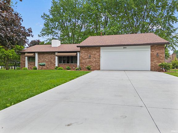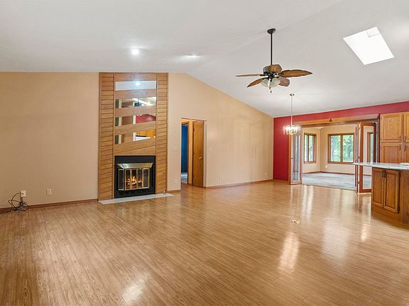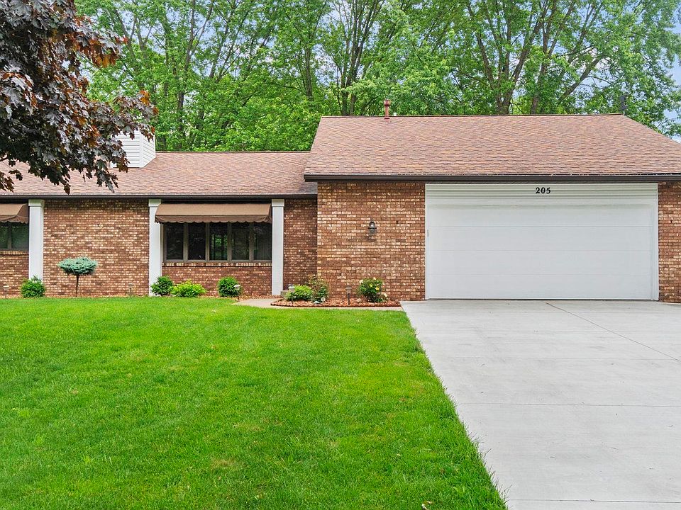 Welcome to 'The Hood'... where you will love living! This area is known for it's popularity and rare availability. This ranch home features over 1,900 finished sq. ft. while sitting on a half acre lot. Brickfront + great curb appeal welcome you as you pull in. Right at the front door is the living room with vaulted ceilings and an open concept floor plan. Showcasing beautiful laminate floors through this area, tall ceilings, floor to ceiling fireplace wall, and recently upgraded Cambria countertops at the kitchen. Anyone will enjoy cooking in such an open, airy space and have the luxury of a kitchen island. Just off the dining space, is a large sun room with stunning slate tile floors, skylights, allowing even more natural light to filter in. A split bedroom floor plan allows for privacy, with the primary bedroom on one end and additional bedrooms, and bath at the other. The primary bedroom features a shed style ceiling, open vanity area with double sink vanity and separate shower room. Additional upgrades include new driveway in 2023, furnace in 2021, landscape in 2023, siding in 2024 and irrigation system!