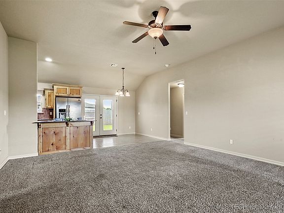 One owner home is move-in ready on a corner lot across from green space. Open floor plan with split bedrooms. Primary bedroom features 10ft ceiling with ceiling fan, walk-in closet, full bath with double sink vanity. Secondary bedrooms are a nice size with spacious closets. Open living, dining & kitchen all under 10' ceiling with french doors leading to spacious covered patio. Storm shelter in garage for protection in those Oklahoma storms. Smaller neighborhood with no HOA.
