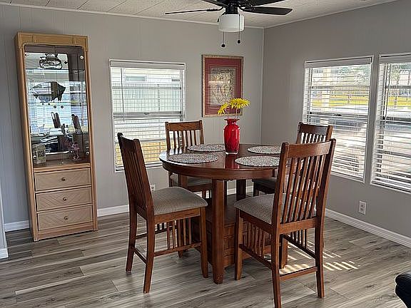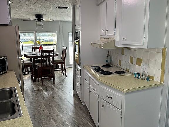 Beautiful mobile home in a 55+ community with an affordable $155 maintenance fee which includes water, garbage pick up at your home twice a week, and lawn service. All new sub floors, flooring and vapor bearer in 2025. Heat and A/C new in 2023. Entire house freshly painted in 2025. Partially furnished. Washer/dryer hookups. Panoramic view of the lake. Active park with pool, shuffleboard, CornHole, golf, bowling, monthly dances and lots of card games and bingo.