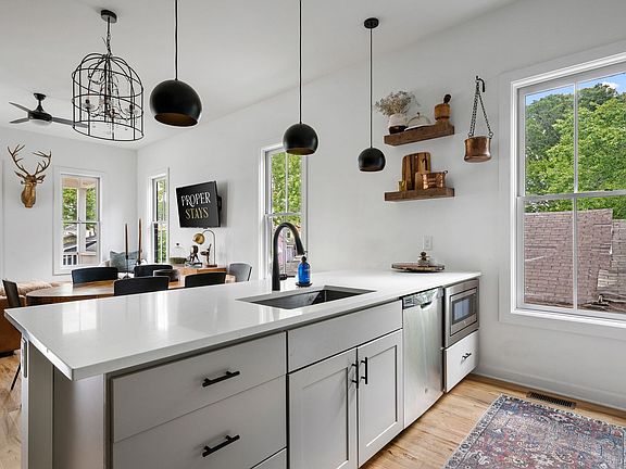 The open concept kitchen and living room create a seamless flow for entertaining guests or enjoying quality time with family. In the living room you will find a comfortable sectional sofa, and a smart TV. There is a dining table with seating for up to six people that separates the kitchen from the living room. The beautiful, modern kitchen features bar seating for two, both marble and butcher block countertops, stainless steel appliances and plenty of cabinet space. There is a half bathroom just off of this area for your convenience!