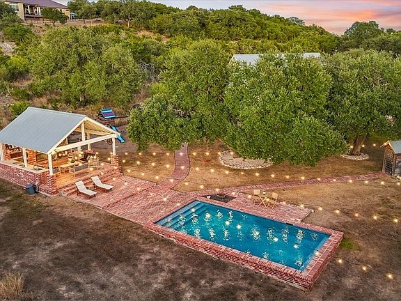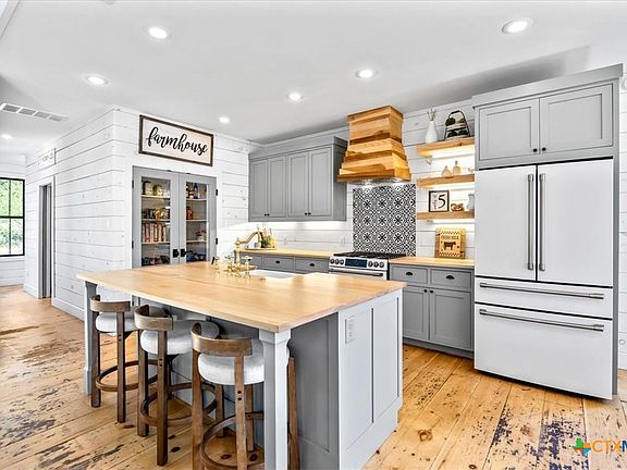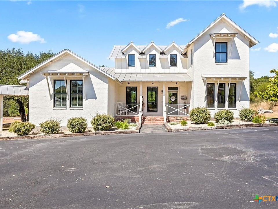 Where Hill Country elegance meets modern farmhouse living. Experience Hill Country elegance with modern farmhouse charm in this thoughtfully crafted custom residence, situated on 2.95 peaceful acres in the desirable River Chase community. From the welcoming front porch to the light-filled interiors, this home radiates warmth, comfort, and refined craftsmanship. Inside, vaulted ceilings, shiplap walls, and rustic hardwood floors create an inviting atmosphere that feels both fresh & timeless. The open living and dining areas flow effortlessly into a designer kitchen featuring custom cabinetry, butcher-block countertops, classic hardware, a striking backsplash, and a generous island with seating. A walk-in pantry and GE Cafe appliances complete this stylish and functional space. The private primary suite offers a serene escape with a freestanding clawfoot tub, spacious walk-in shower, and custom closet. Additional highlights include custom barn doors, a dedicated laundry room, and thoughtful details throughout. Step outside to your private Hill Country haven, where every feature is designed for relaxation and entertaining. The covered outdoor pavilion, complete with a wood-burning fireplace, built-in grill, and charming brick accents, sets the stage for unforgettable gatherings. The sparkling pool, framed by mature oak trees and twinkling string lights, adds a resort-inspired touch, while the rustic "outhouse" pool restroom delivers a playful nod to classic country living. Pet lovers will appreciate the home's unique Puppy Playroom, complete with its own AC unit, TV, and tiled dog bath, a true luxury for your four-legged family members. A three-car detached garage and paved circular driveway add convenience and functionality. Perfectly located just minutes from Gruene, Canyon Lake, and downtown New Braunfels, this home embodies the very best of Hill Country living, where modern design, everyday comfort, and timeless charm come together in one unforgettable property.