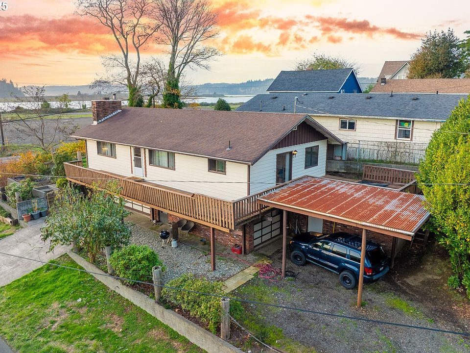 Watch brilliant sunsets over the majestic Umpqua River from your living room, kitchen, primary bedroom and deck on main level. This solid well-built home features a 50-yr roof,redwood siding, steel support beams and expansive decks. Lower floor has huge 3 car plus garage/shop area with half bath and pellet stove or add more living space. Covered RV parking/hook up, boat parking, and bonus room. Fish, crab, ride the dunes and walk the ocean beaches, all just minutes from this unique property.