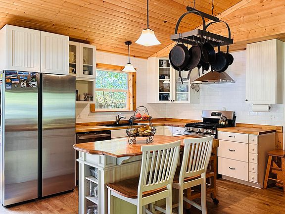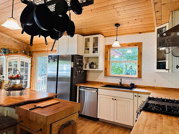 Beautiful semi-private setting is home to this enchanting Craftsman cottage in the Bigfoot Capital of World, known as Willow Creek! Open floorplan, 1088 square feet, 1 bedroom, 1.5 bathroom; possible 2nd bedroom being used as indoor laundry room & pantry. Knotty pine wall & vaulted ceilings, bay window, screen porch off dining area, doors off both rooms to back deck and tranquil back yard, with a trail to the river. Kitchen boasts subway tile backsplash, butcher block counters, kitchen island, gas range with hood. Woodstove and mini split heat pump for keeping you warm in winter; air conditioner to keep you cool in summer., 'Guest Cottage' in back yard has one side for guests and the other for even more storage. Fenced garden area with fruit trees. Must see to appreciate.