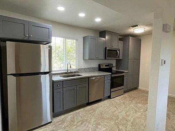 Tile flooringSleek tile flooringStainless steel appliancesGranite countertopsModern kitchenCentral heating and coolingCeiling fans