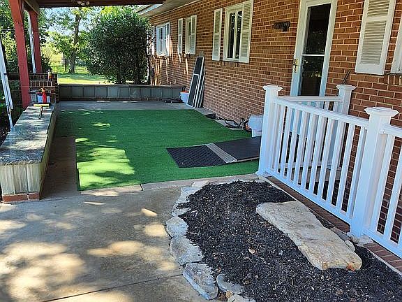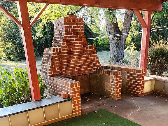 Outdoor fireplaceBrick arched front entranceBrick homeLots of storage spaceHardwood floorsCovered rear patioMature trees and landscaping