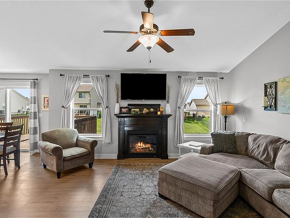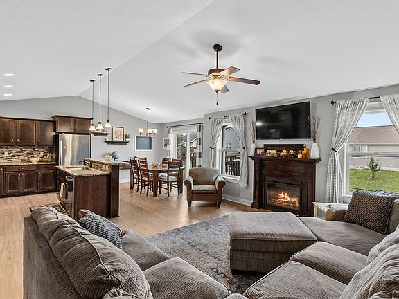 This charming Grimes ranch home is located on the NW side of town in a fantastic neighborhood, on a culdesac, within walking distance to Heritage Elementary. Offering over 2400sf of living with 4 beds, 3 baths and a great open concept! You’re invited in by the charming front porch to an open concept great room w/new LVP flooring, vaulted ceiling & stone FP that adds charm. The kitchen offers warm wood cabinetry, granite counters, SS appliances & the dining room leads to the generous sized deck. The large primary suite has a tray ceiling & incl ensuite bath w/ dual vanity & large closet connected to the laundry room for convenience! This leads to the mudroom & out to the garage. 2 additional BRs & full bath complete this floor. The lower level is the perfect space to hangout w/built-is & projector, 4th BR & full bath. A large unfinished area is framed for a flex room & still provides plenty of storage. The garage has great built-in storage & a 3rd stall parking pad has been added! All information obtained from seller and public records.