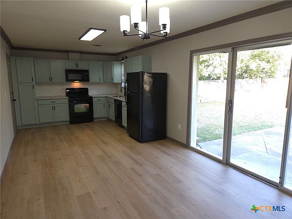The heart of the home, the kitchen, is a culinary delight with newly painted cabinets, exquisite granite countertops, and a modern farmhouse faucet with a garbage disposal. The kitchen and dining areas are now beautifully lit with new lighting fixtures. All appliances are included, featuring a gas range, microwave, dishwasher, and refrigerator, making this kitchen move-in ready.