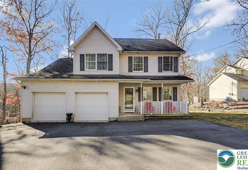 TRADITIONAL COLONIAL CHARM MEETS MODERN COMFORT! Welcome to this updated 3BD/2.5BTH Colonial with paved driveway and 2-car garage on a quiet, tree-lined corner in gated, amenity-filled Saw Creek Estates! Step inside to a bright interior featuring fresh paint, new floors, sparkling chandeliers, and stylish hardware. The Living Room centers around a sleek electric fireplace, creating a cozy yet modern feel. The Kitchen offers ample cabinetry, granite countertops, tile flooring, mosaic backsplash, and a breakfast bar with pendant lighting. Adjacent Family Room features a wood-burning fireplace with a beautiful tile and wood surround—perfect for gatherings. Upstairs, find spacious bedrooms with double and walk-in closets. The Primary Suite boasts a private bath with jetted tub, double vanity, and separate shower. Enjoy outdoor living with a covered front porch for morning coffee and a back deck ideal for entertaining. Includes Central A/C, public water/sewer, and an unfinished basement for extra potential for added living space. HOME INCLUDES A 1-YEAR AMERICA’S PREFERRED HOME WARRANTY! Saw Creek Estates offers resort-style amenities: indoor/outdoor pools, sports courts, fitness centers, playgrounds, skiing, a restaurant, and year-round recreation—all surrounded by the beauty of the Pocono Mountains. Convenient to community amenities, major roads, and local attractions. SCHEDULE YOUR TOUR TODAY!