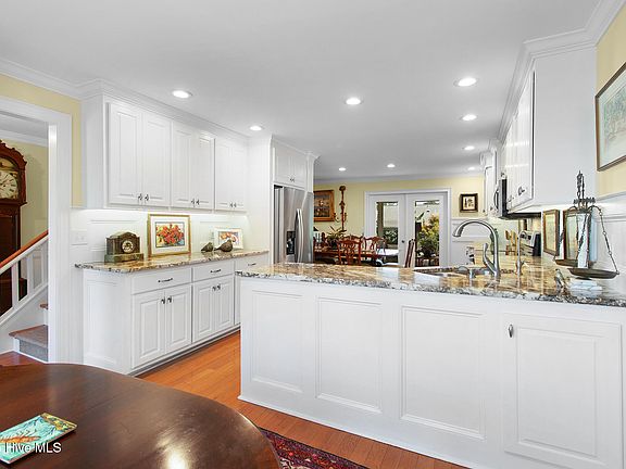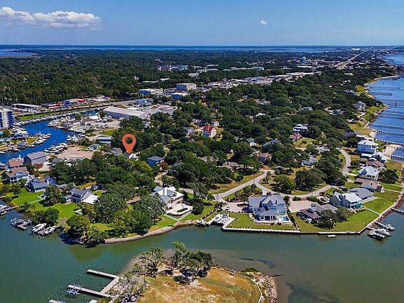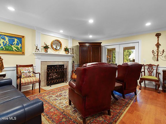Perched high with views overlooking Peletier Creek, 205 Roanoke Avenue offers timeless and inviting interiors, an outdoor oasis, and is centrally located. With several neighborhood marinas nearby, this waterfront neighborhood is one of Morehead City's best-kept secrets! The front of the home welcomes you down a walkway framed by beautiful maple trees, rose bushes, and lush landscaping along the driveway. A covered stoop leads into a bright foyer with hardwood floors that flow through the main living areas. The sunlit study with a bay window sets the tone, while the kitchen blends luxury and comfort with granite countertops, custom cabinetry, stainless steel appliances, and a breakfast nook—also with a bay window—that fills the space with natural light.
