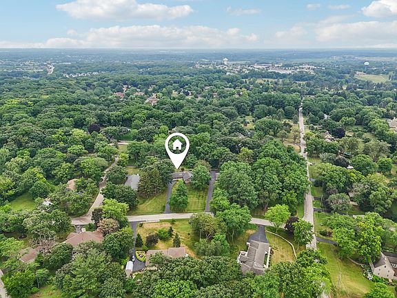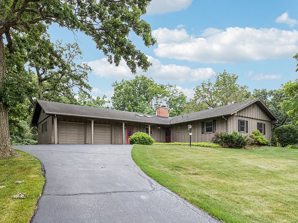 Mid-century vibe meets modern comfort in Sherwood Oaks! Perched on a hill beneath a canopy of mature trees, this beautiful ranch home offers timeless character and an inviting front porch. Step inside to a welcoming foyer with an exposed brick accent wall and open staircase to the finished lower level. The kitchen flows seamlessly into a spacious breakfast room and cozy family room with beamed ceilings, skylights, and a stunning full-wall brick fireplace. The show-stopping great room is filled with natural light and features custom built-ins and walls of windows. A serene bedroom wing includes three generously sized bedrooms and two full baths. The primary suite has its own private bath, while the hall bath boasts a soaking tub and separate shower. Downstairs, you'll find a second family room with a fireplace and a large utility/workshop area with built-in workbench. The oversized 2.5+ car garage provides exceptional storage. Sitting on nearly 3/4 of an acre, enjoy the peaceful backyard from your patio. Fantastic location-minutes to downtown Elgin, Metra, I-90, 15 minutes to Woodfield Mall, 25 to O'Hare, and just an hour to downtown Chicago.