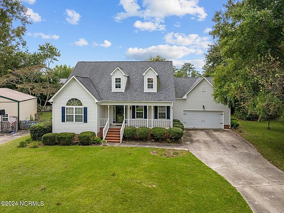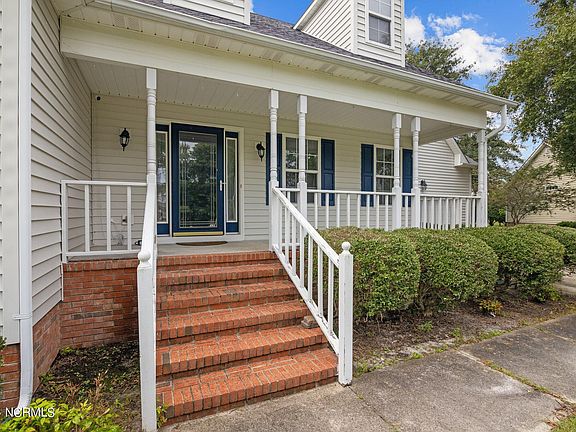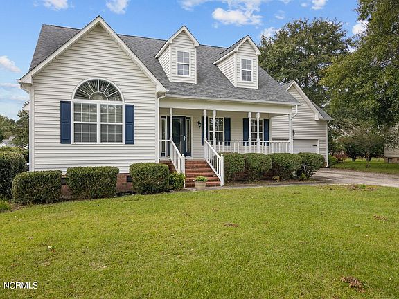 Picture yourself in this 3 bedroom, 2 1/2 bath home tucked in a cul-de-sac in the Trolley Run section of the Ghent Neighborhood near downtown New Bern. From the welcoming front porch to the charming sunroom right off the kitchen, and the back deck and pergola, you'll love this bright, open home. The foyer is two stories, offering a roomy, sunny welcome into this almost 2000 square foot home, which features a large living room with built-in shelving, tall ceilings, and a fireplace with gas logs. The convenient first floor primary suite features vaulted ceilings, a large walk-in closet, en suite bath with double vanities, and a walk-in shower. You'll also enjoy a spacious, pretty yard with mature greenery, as well as off-street parking and a two-car garage. This home is just blocks from the YMCA, and is convenient to the hospital, shopping, restaurants, and historic downtown New Bern, and is in a desired school district. Make your appointment to see this home before someone beats you to it!