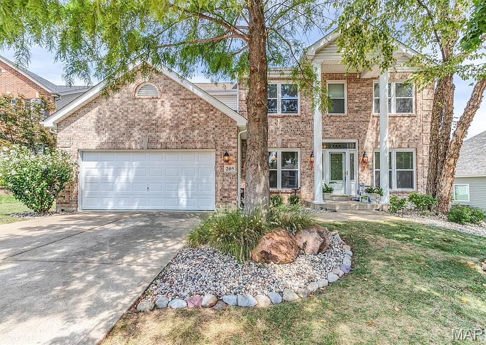 Kitchen has a butterfly island, 42 inch maple cabinets, granite counters, stainless appliances, undermount composite sink, Butler shelf, planning desk, open breakfast room and formal dining room. Dining Room has a beautiful tray ceiling with lower board and batten walls. The laminate floors look like hardwood floors. Laundry has extra built in matching cabinets. Rear staircase, landing and loft, large picture window, Massive Primary bedroom suite and luxury primary bath. Dual sinks, soaking tub, separate shower. Three more generous size bedrooms with large closets. Lower Level is ready for your finish. Backyard is a level lot, completely fenced. Nice rear patio. Exterior has architectural shingle roof, vinyl siding, full brick front with grand pillars. Well maintained home and yard. Professionally landscaped. Home is so close to Cottleville and all of the amenities. Close to highway access and shopping but yet tucked away and the haven of a culdesac. Come check it out! You will love this home!