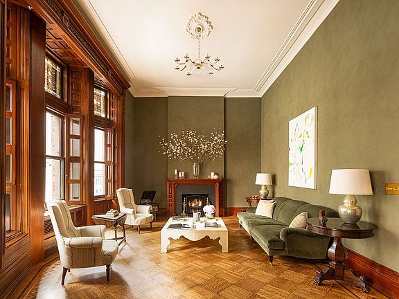 Upon entry, you're greeted by dual formal living rooms with soaring 14-foot ceilings, richly restored mahogany paneling, wood-burning fireplaces, and a stunning Tiffany Studio-designed bay window with leaded glass transoms. Ornately carved doorways and window frames, oak parquet floors, and plaster crown moldings elevate every corner.