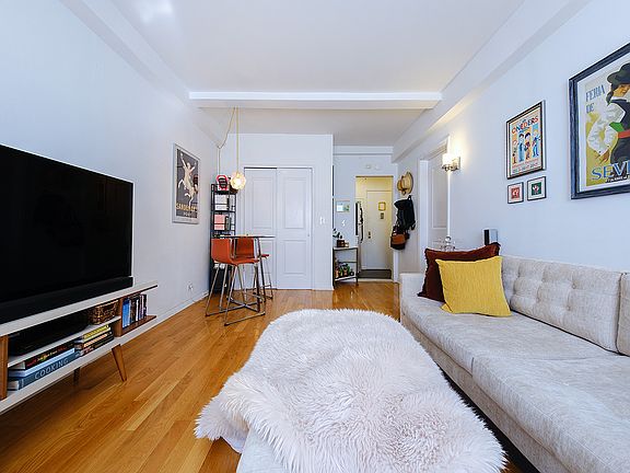 All windows face southStainless steel appliancesFacing southWhite quartz countertopsKitchen in entry foyerSunny spacious one-bedroom