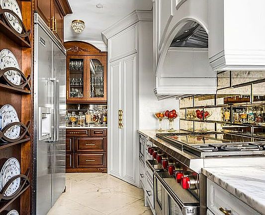 Through another architectural arch, just off of the dining room, is the fantastic, windowed, enormous designer kitchen. Here -- with custom cabinetry and built-ins, marble-topped counters, a large pantry, top-shelf appliances (Wolf -Viking - Sub Zero), dual dishwashers, and a full-sized washer and gas (vented) dryer, culinary dreams unfold.