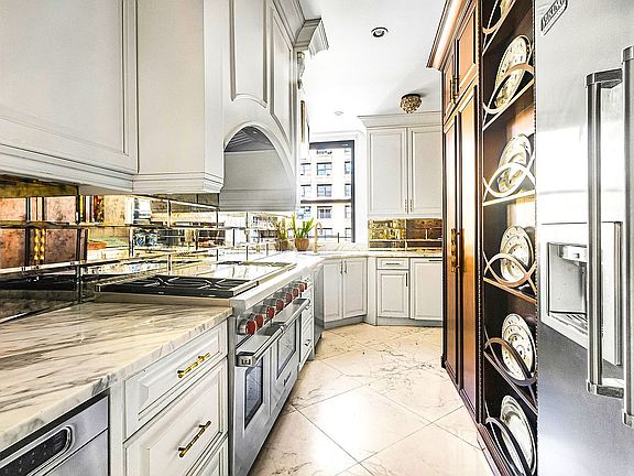 Customized for stretch-out living and elegant entertaining, all eight rooms of this expansive residence offer exterior exposures: Five rooms face East overlooking the building's lush, private English garden, and three rooms face West with city views and wonderful Western light. A gracious central gallery centers this home, leading to all of this home's extra-large rooms. On one side -- through one of this home's signature arches -- is an enormous living room. This vast space is crowned by a tray ceiling, and offers a decorative fireplace, wet bar, and three oversized windows onto the building's signature private garden. On the other side -- through another attractive arch -- is the massive dining room that easily accommodates fourteen. With plaster moldings, a working, wood-burning fireplace (with custom tiled mantle), and two big. West facing, sunset windows, this immense dining room flexibly accommodates a second living room or a hybrid dining/den.