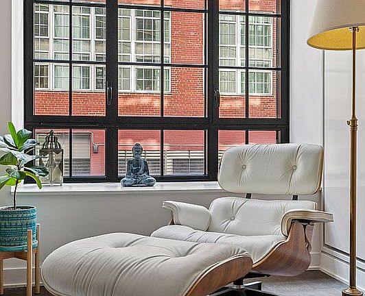 The home features a split-bedroom design for privacy and an open, airy flow. Upon entering, you are welcomed by a gracious foyer that leads into a loft-like great room with high ceilings and elegant 5 inch fumed white oak floors. Light streams through two enormous south-facing windows framed in sleek black metal, with double-layered insulated glass. These oversized windows provide not only energy efficiency but also a pin-drop quiet living experience. There are also custom-designed, motorized window treatments, recently installed across all four windows.