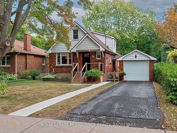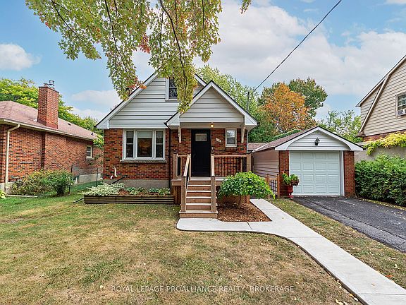 Welcome to 205Westdale Avenue - a storybook 1.5-storey brick home nestled on a quiet, treelined street in one of Kingston's most loved, walk-able neighbourhoods. With its striking curb appeal, newly poured walkway, fresh landscaping, and charming covered porch, this home makes a statement before you even step inside. Once inside, you'll find thoughtfully preserved charm paired with smart updates and functional spaces. The bright, formal living and dining rooms are perfect for everyday living or entertaining guests; while a cozy family room with closet space offers the flexibility to host visitors or convert into a main-floor bedroom. Plus, big picture and corner windows brighten every room, and versatile modern blinds let you enjoy sunshine, privacy, or a soothing evening atmosphere with ease.The stylishly updated bathroom features a wonderful walk-in shower, and the vintage eat-in kitchen offers room for your own creative touches. Upstairs, two additional bedrooms share a large central closet and enjoy natural light filtered through mature treetops. Of course, you can also turn one of those rooms into your very own personal dressing room or home office if you wish. Meanwhile, the lower level adds even more extra space with a partially finished rec room, laundry area, and ample storage. Step outside and discover a private backyard oasis oversized, lush, and featuring beautiful mature trees and bushes. Enjoy your summer evenings on the back patio or tackle weekend projects in the deep detached garage with rear workshop space, conveniently connected by a covered breezeway to the side entry. With a long driveway, newer shingles, furnace, central A/C, and upgraded front entry, this home is turnkey and timeless. Located steps to parks, schools, shops, and a quick commute to Queen's and downtown, this special spot checks all the boxes for couples, small families, students, and professionals alike. Come see why 205Westdale is more than a house it's a place to feel at home.