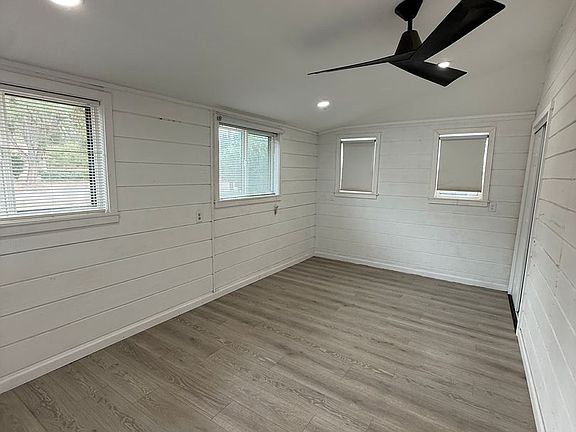 Modern vinyl plank flooringPrivate front patioCeiling fanTile bathroomGas stove