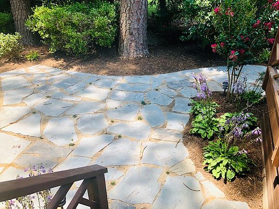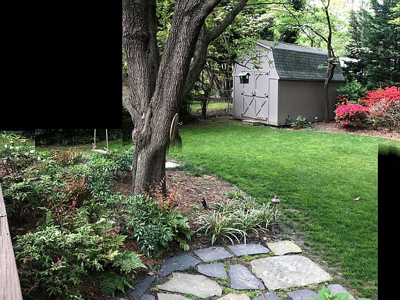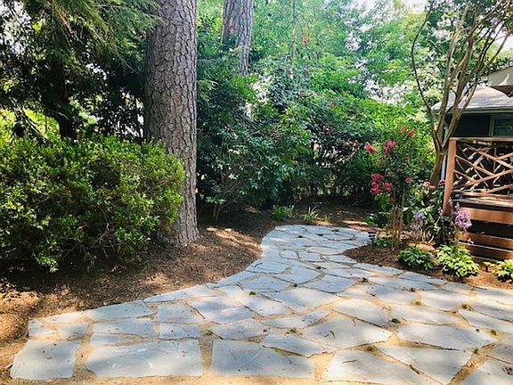 Stone pathBeautiful backyard landscapingOpen kitchenWrap around deckWalk in closet
