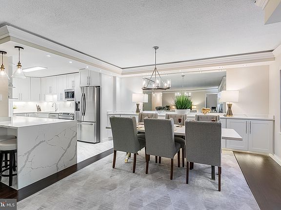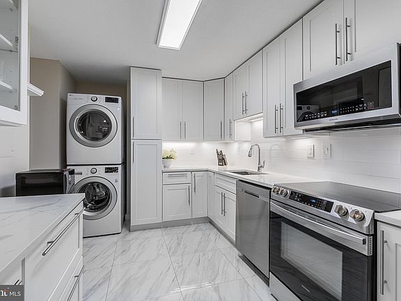 Welcome to resort-style living inside the Beltway! This stunning 3-bedroom, 2-bath, 1,621 sq. ft. condo in the sought-after Watergate at Landmark (Building 2) combines modern luxury with unmatched convenience. Perfectly positioned on the 2nd floor, this desirable corner unit offers extra privacy and a spacious private balcony overlooking lush greenery. Inside, the reimagined chef’s kitchen is a true showstopper—featuring custom white shaker-style maple cabinetry with soft-close doors and drawers, quartz countertops, under-cabinet lighting, and sleek 24”x24” porcelain tile flooring. High-end stainless steel appliances include a refrigerator with ice maker, electric range, microwave, and a full laundry center with stacked front-load washer and dryer. A wrap-around breakfast counter with seating for four creates the perfect spot for casual dining, while extended cabinetry into the dining area adds valuable storage and serving space. The spacious owner’s suite offers three closets—including a large walk-in—for outstanding storage. The second bedroom is spacious, and the third has been redesigned as a bright, functional home office with both a windowed door from the living room and a solid entry door from the hall. Additional highlights include: Luxury sustainable bamboo flooring throughout the living, dining, and bedrooms (no carpet!). Spa-inspired baths with porcelain tile and a dual-height jet spray shower, Extensive LED recessed lighting. Beyond your front door, enjoy the unmatched amenities of this 37-acre gated community: indoor and outdoor pools, indoor and outdoor tennis courts, racquet club, fitness and jogging trails, landscaped gardens, picnic gazebos, and more. The condo fee includes all utilities (electric, gas, water, sewer, trash, and building antenna) plus four unassigned parking passes. This is more than just a home—it’s a lifestyle. Modern updates, resort-style amenities, and a prime location inside the Beltway make this condo the complete package.