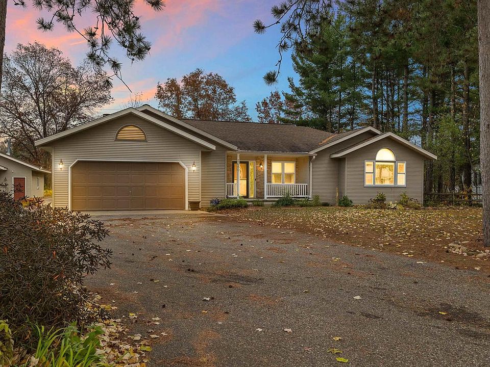 Discover this stunning executive-style 3-bedroom, 3-bath ranch home perfectly situated on a spacious, private lot. Featuring both a 2-car attached garage and a 2-car detached garage (insulated and heated), this home combines functionality, comfort, and style. The beautifully updated kitchen shines with painted white cabinetry, epoxy countertops, a sandstone black sink, black stainless steel appliances, ceramic tile flooring, and modern light fixtures. Charming barn doors conceal the laundry area while adding a touch of rustic elegance. Enjoy a spacious living room with a wood-burning fireplace and patio door access to a maintenance-free backyard deck, perfect for relaxing or entertaining. A formal dining room with updated laminate flooring offers flexibility for use as an office or den. The primary suite is a true retreat, featuring an arched window, walk-in closet, and a luxurious private bath with an updated walk-in shower. The partially finished lower level extends your living space with a large family room, corner gas-log fireplace, wet bar, game area, storage closet, full