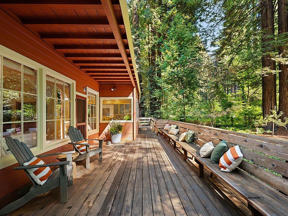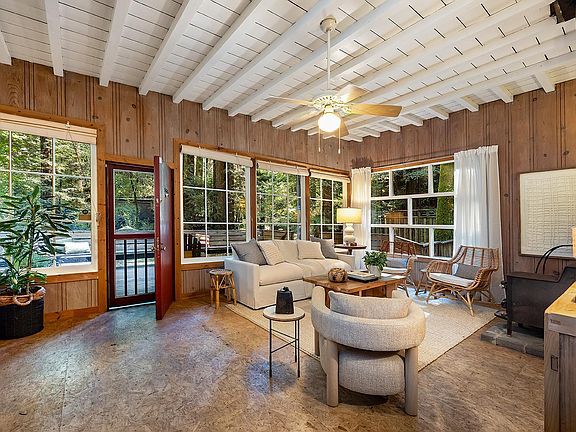 Surrounded by filtered sunlight and the quiet grace of towering trees, lies a truly rare offering: a lovingly maintained residence for the first time on the market in more than 40 years. Set on nearly half an acre, this 1,558sqft home offers 2 bedrooms and 1 bath. Step into storybook charm via a broad, sun-soaked wrap-around deck with built-in bench seating, a gracious welcome, perfect for both quiet mornings and festive gatherings. Inside, you'll find exposed craft-beams and vaulted wood ceilings, conjuring a refined yet rustic mid-century cabin-style aesthetic. Bright and open, the kitchen is gracefully positioned between the dining and family areas, where natural light pours in creating a perfect flow for effortless entertaining. The primary suite is a serene retreat: imagine arched ceilings, wood beams, generous windows overlooking the forest, and exterior access to a spacious deck. Outside, a self-contained additional space with a private entrance offers the perfect spot for guests or a creative studio. The level lot offers generous parking, including space for an RV or boat, and just a few doors down you'll find convenient access to Austin Creek for nature lovers and outdoor adventurers alike. A rare presentation: fully and truly one of a kind. Don't miss this opportunity.