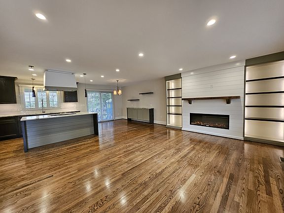 The main level consists of an open-concept layout connecting the kitchen, dining room, and living room. Abundant natural light fills the space, thanks to the clearing of several trees and slatted blinds on each window. The floors gleam with a beautiful, refinished wood stain. In the living room, an electric fireplace is flanked by two built-in bookcases while the adjacent dining room includes matching floating shelves above built-in cabinetry.