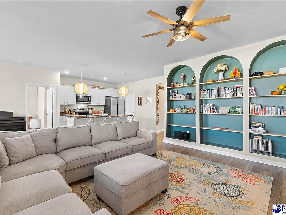 Friendly communityOverlooking a beautiful pondScreened-in porchEye-catching three-arch built-in bookcases