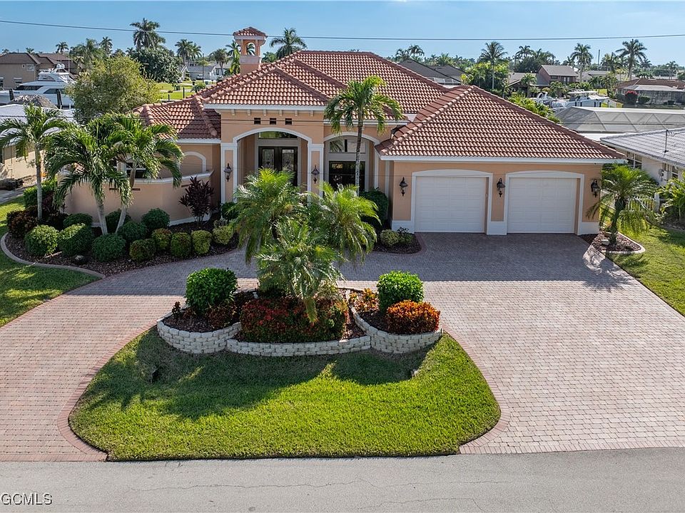 You won't find many like this one!! Don't miss this extraordinary, custom built 3 Bedroom / 3 Bath gulf access pool home located in popular SE Cape Coral on a 200' canal and just minutes from the river! Built by luxury builder Aubuchon Homes, this home boasts over 2,800 sq.ft. of living space with numerous upgrades and expert craftmanship throughout including custom kitchen cabinetry, granite counter-tops with bar, attractive black appliance package with double oven, convenient island cooktop with additional storage, walk-in pantry and a kitchen nook over looking the pool, with wet bar, wine cooler and glass rack. The front entry features solid wood 8' double doors with lead-glass in-lay and an attractive floor medallion leading into the huge living room with 18" neutral tile throughout, built-in entertainment center, with lighted glass shelving, cabinet storage, gorgeous hand painted murals, cathedral ceilings and 90 deg. sliders opening the room to the pool and lanai area! The home office / den area is just off of the living room separated by French Doors and additional outside French Door entry and has attractive wood flooring, lighted tray ceiling and also has easy access to the kitchen area. The master bedroom features sliders to the lanai and pool, lighted tray ceiling, neutral plank tile flooring, electric fireplace, huge walk-in closet and the master bath has two separate vanities with custom cabinet storage, and separate make-up station, garden tub with it's own fireplace and television, walk-in shower and a private outside tropical shower as well! Enjoy your days and evenings in this one of a kind private pool and spa with lush landscaping, rock waterfall, lazy stream and in-pool bar stools! Entertaining will never be the same with the outstanding summer kitchen with stainless steel grill, refrigerator, sink and granite bar! And for the ultimate waterfront lifestyle and boating experience you have your own 12' x 12' Tiki-Hut (new thatch roof in 2023) over the water on your expansive dock with over 1,200 sq.ft. of deck and two huge boat lifts with canopies with 20,000 lb., and 10,000 lb. capacity! The builder here did not forget about your prized cars with an oversized two car garage with 10' x 8'doors for ease of entry, epoxy coated flooring and ample garage cabinets for storage! New tile roof in 2022, climate controlled pool storage room, oversized lot, no flood damage, furnishings negotiable and rear Southern exposure too!!