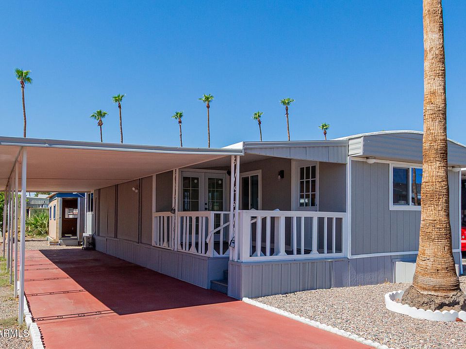Welcome to a fully renovated 2 Beds - 2 Baths Mobile Home in the adult 55+ Community of Desertscape in the city of Phx! This beautiful gem offers modern style and great comfort. Enjoy the convenience of parking with a tandem carport and relax your morning coffee or evening sunsets creating your own style on the charming front porch. The open living space featuring an appealing open layout with a soothing palette and attractive wood-look flooring for a timeless appeal is priceless. The kitchen features quartz countertops, backsplash, white shaker cabinets, contemporary lighting, and brand-new stainless-steel appliances. Community amenities include a recreation center, clubhouse, fitness center, library, and refreshing heated swimming pool & spa. Pick this lock and you'll get your key!