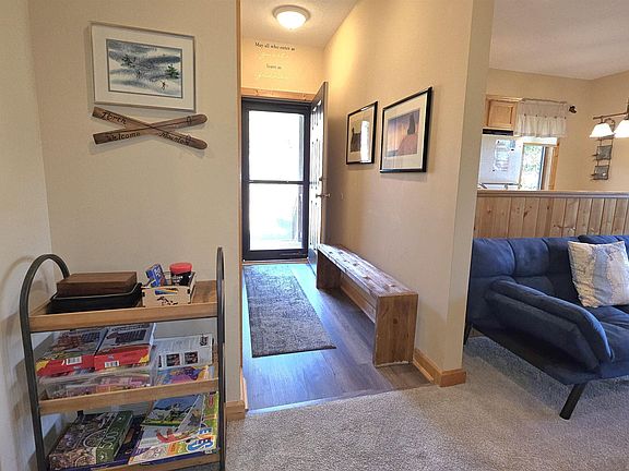 Tranquil views of the first fairway at Schuss Golf Course, paired with picturesque winter scenes of Schuss Mountain. This end unit features 2 bedrooms, 2 bathrooms, a space-saving kitchen banquette, custom built-ins, a gas fireplace, a generously sized covered porch and outdoor storage. New furnace, washer, and carpet plus sold with furnishings and outdoor furniture. Short term rental and owner pet friendly.