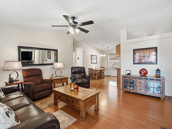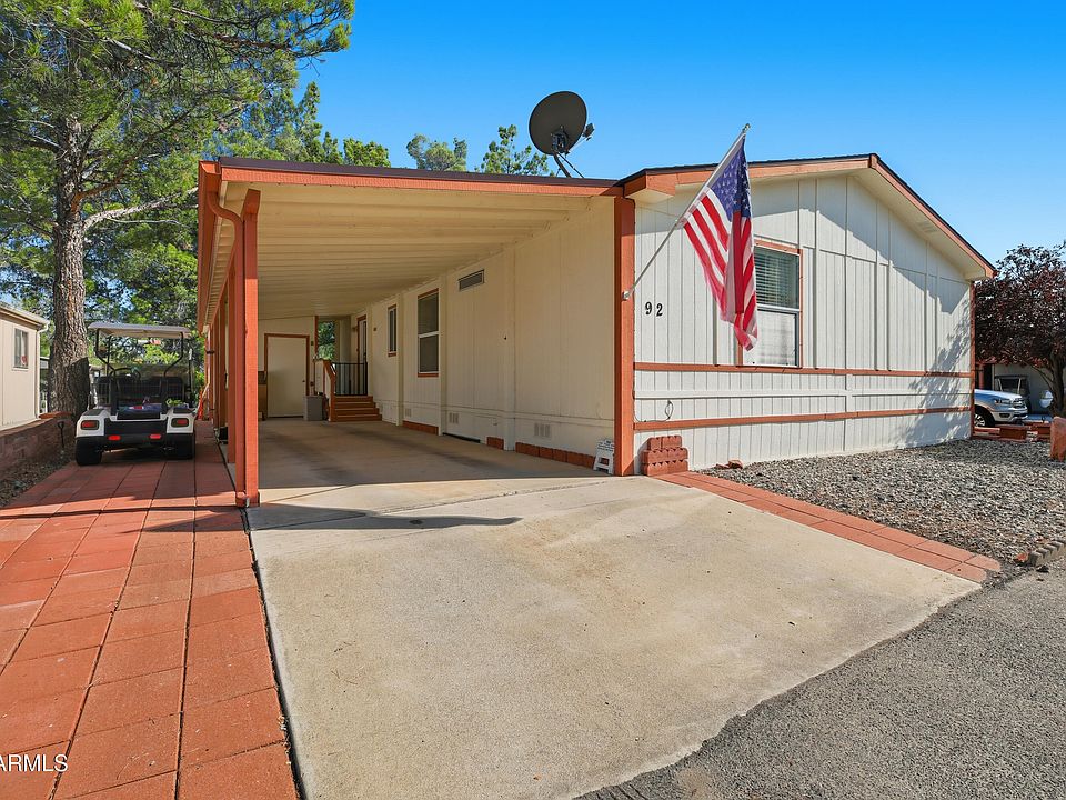 Come experience the best age qualified resort style community in the Verde Valley. Located on leased land in beautiful Pine Shadows Mobile Park, where the trees are tall and the golf course is green! This 55+ active lifestyle community is full of incredible amenities to keep you energized. This sweet 3 bedroom 2 bathroom home has been lovingly maintained and shows great pride of ownership. A new roof was installed in 2024, a new water heater in 2019, home was re-leveled in 2020, and a newer washer and dryer are included. This home offers a split floor plan with the primary on one side and the other 2 bedrooms separated by the open concept living and dining room, making it a comfortable space for all. A new iron fence was installed in 2022, giving pet owner's peace of mind and ease. This home is also conveniently located a short walk to the community dog park and clubhouse.
